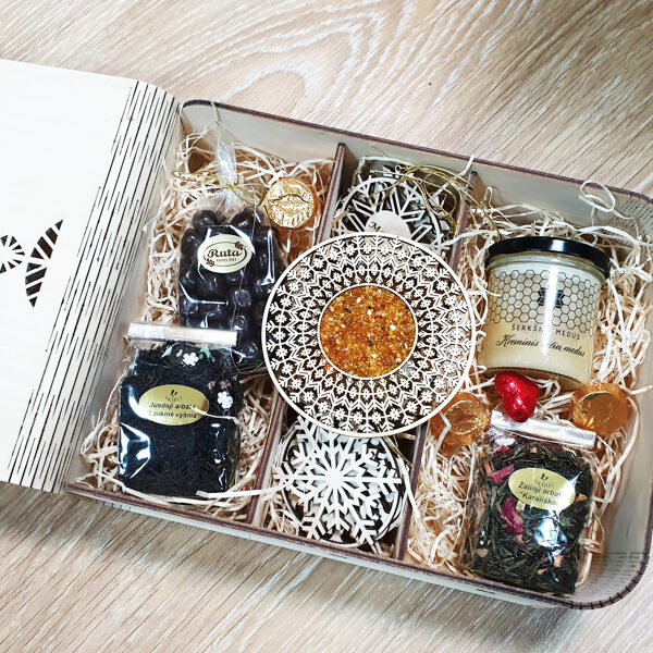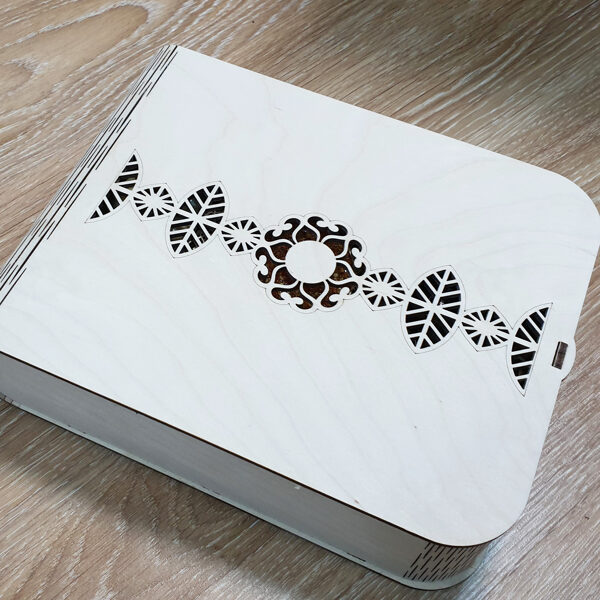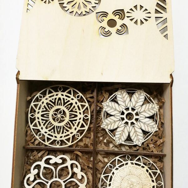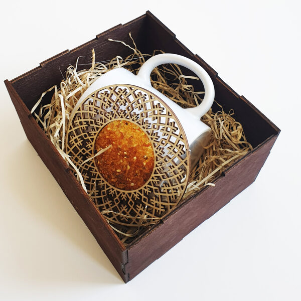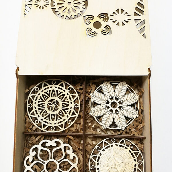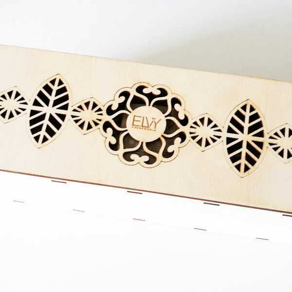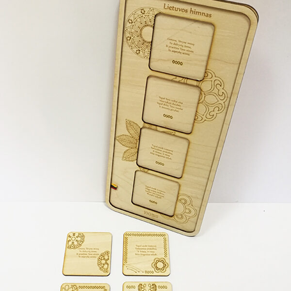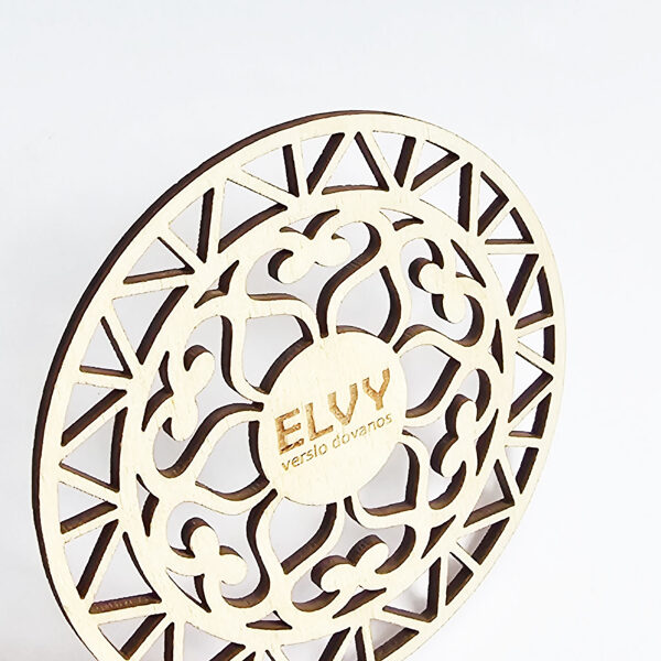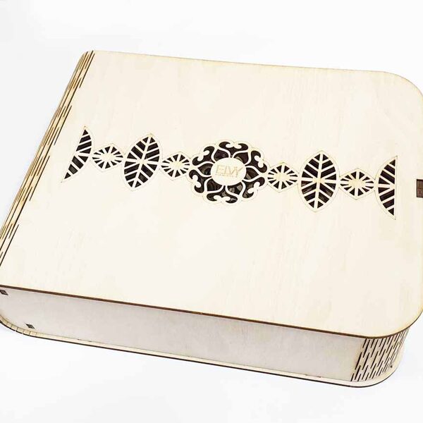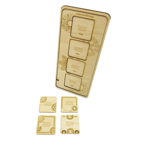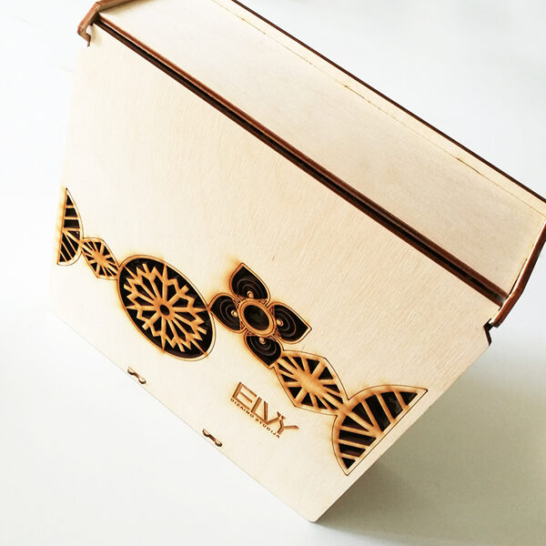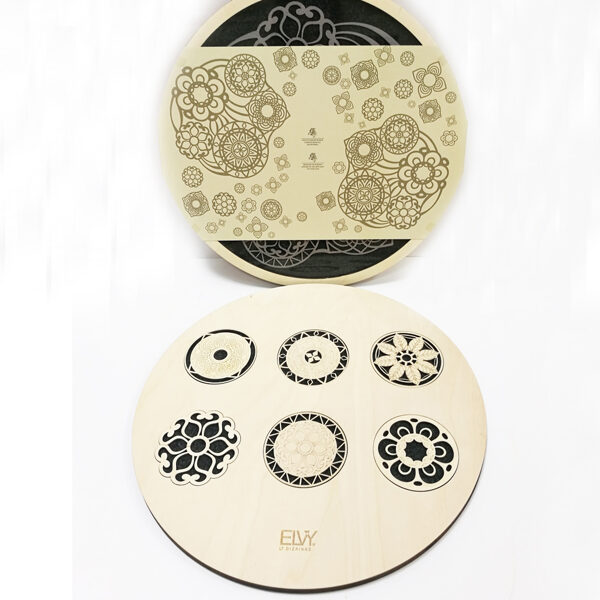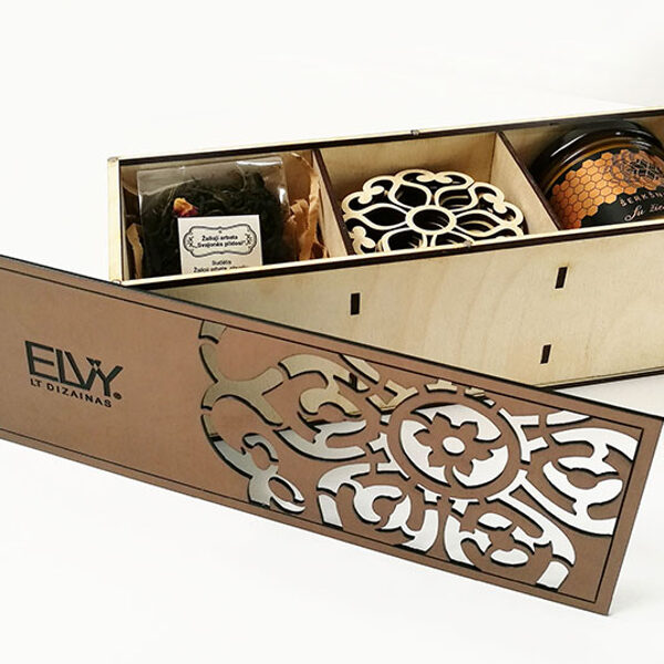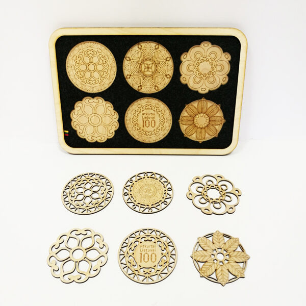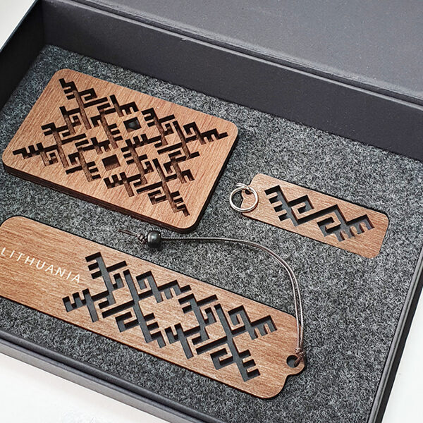 Padėkliukų, dėžučių ir dekoratyvinių verpsčių ornamentai sukurti remiantis lietuvių liaudies tautinių raštų motyvais. Stilizuoti augalų ir gyvūnų raštai perteikti per geometrines formas, neperkrautas detales ir dailiai išpildytais fragmentais sudaro puikų šiuolaikiškumo ir senosios istorijos ansamblį.